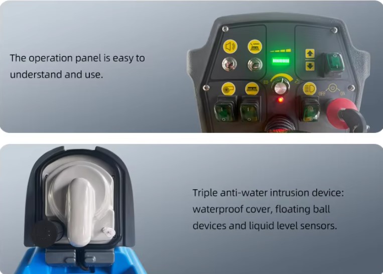 Rengøringsmaskine J115 er udstyret med en automatisk bremsefunktion, så maskinen standser, når betjeningspedalen slippes, hvilket reducerer risikoen for uheld. Maskinen klarer skråninger op til 15 % med antiventilfunktioner, inklusiv væskeniveausensor og flydeanordning, som forhindrer vandindtrængning i elektronik. Solenoidventilen i vandforsyningen forhindrer utilsigtet lækage. Det ergonomiske sæde og de intuitive kontroller mindsker operatørtræthed. J115’s kompakte design og manøvredygtighed sikrer sikker navigation i trange områder.