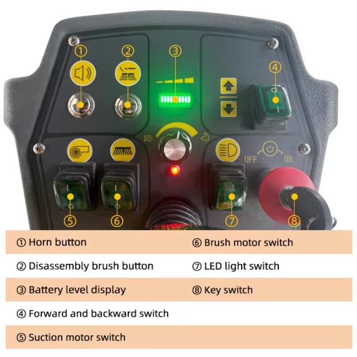 Betjeningspanelet til SMITH Rengøringsmaskine J115 er designet med brugervenlighed og effektivitet i fokus. Her er en oversigt over knapper og funktioner: